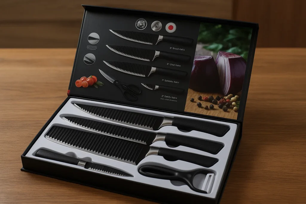 O mais surpreendente é que o valor promocional equivale ao preço de apenas uma faca — ou seja, com o valor de uma peça, o cliente leva o conjunto completo com 6 unidades.